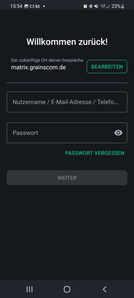 Geben Sie den Matrix-Benutzernamen und das Passwort ein, wählen Sie dann die Option „Benutzerdefinierter Server“ und geben Sie den benutzerdefinierten Domänennamen „matrix.grainscom.de“ ein.