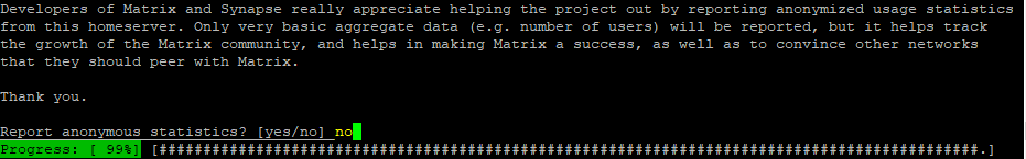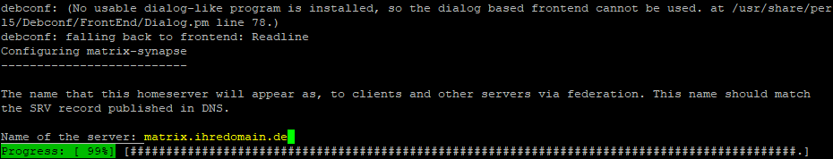 Während der Installation werden Sie nach dem Namen des Matrixservers gefragt – geben Sie den Matrixdomänennamen’matrix.ihredomain.de‘ ein.