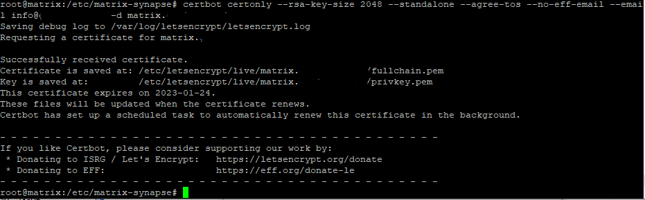 certbot certonly --rsa-key-size 2048 --standalone --agree-tos --no-eff-email --email ihre@email.com -d matrix.ihredomain.de
